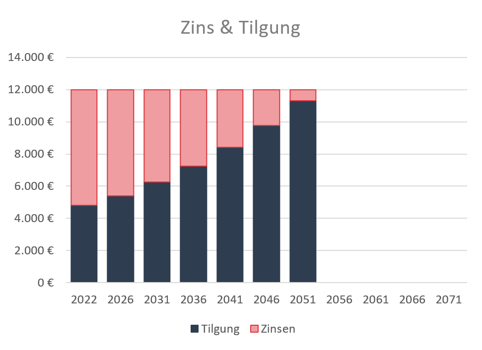 Diese feste Rate besteht aus den Zinsen und der Tilgung für den Kredit. Diese monatlichen Raten, die Annuitäten, bleiben somit für die gesamte Zeit der Zinsbindung (der Vertragslaufzeit) fest und werden erst mit dem Ende der Zinsbindungsfrist angepasst.